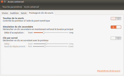 Cette partie permet entre autre, d'activer le clic secondaire, c'est-à-dire l'usage d'un appui long sur le bouton gauche de la souris pour simuler le bouton droit. Cela peut s'avérer également utile pour les souris mac avec un seul bouton.