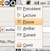 Un clic gauche sur l'icône Audacious réduite dans la zone de notification affiche le logiciel. Un clic droit donne accès à un menu simplifié de l'application, sans afficher celle-ci (capture écran ci-dessous).