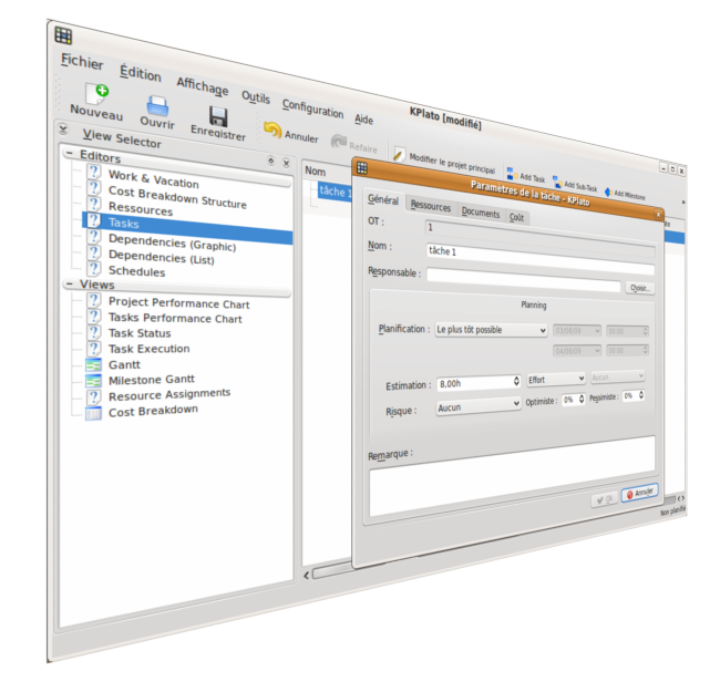 Calligra Plan, anciennement Kplato, est un logiciel 1) de gestion de projets conçu dans le cadre du projet KDE, et plus précisément du projet Calligra. Il permet notamment de réaliser des diagrammes de Gantt. Le logiciel est particulièrement intéressant vis à vis des fonctions avancées de gestion de projet qu'il propose.