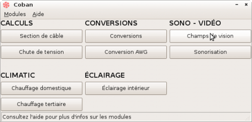 Coban est un logiciel qui regroupe sous un même lanceur plusieurs applications indépendantes de calculs électriques :