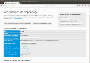 Pour aider au mieux les personnes sur les forums, recopier les Informations de dépannage obtenues via Menu → Aide → Informations de dépannage (ou en tapant directement about:support dans la barre d'adresse).