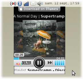 Ensuite, clic-gauche sur l'icône et vous devriez voir apparaître une fenêtre comme celle présentée sur l'image avec une photo de l'album, le nom de la chanson et des boutons de lecture, pause et lien vers le site Deezer.