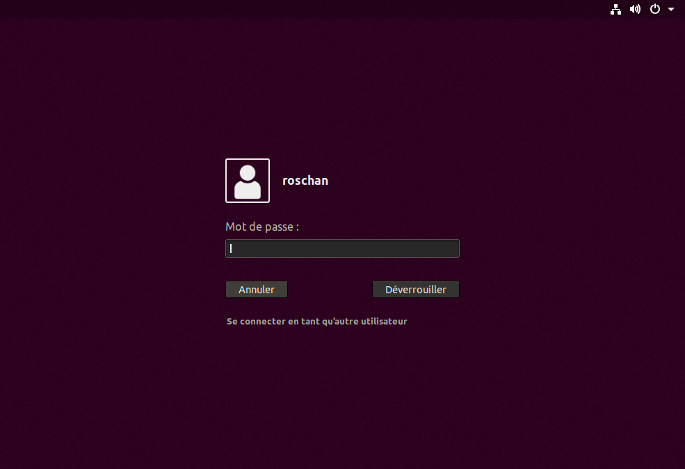 Vous verrez alors apparaître un écran appelé dans cette page « écran de connexion ». On vous demandera alors votre mot de passe pour déverrouiller la session.