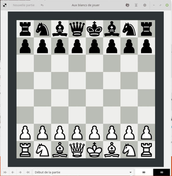 Après avoir lancé glChess, vous vous trouvez face à un échiquier nu. Cliquez sur le menu « Game » (ou « Partie »), puis sur « Nouveau » 1).