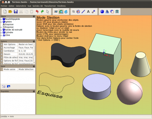 - On peut créer des formes primitives (cube, cylindre, cône et sphère) par le menu Objet 3D ou la barre d'outils du même nom. Une fois créé, le solide peut être modifié (déplacement, redimensionnement, étirement, rotation) dans la fenêtre graphique à l'aide de la souris en sélectionnant les icônes de manipulation. Les dimensions peuvent aussi être saisies au clavier dans la fenêtre Propriétés du panneau latéral.
