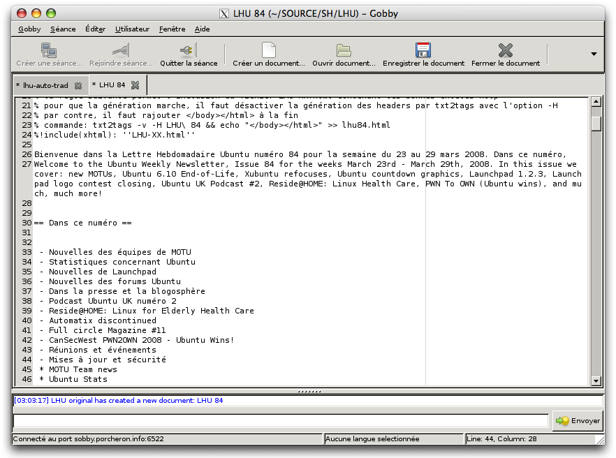 Voilà ! Vous avez maintenant un fichier nommé Issue84 qui contient le source anglais et un autre nommé LHU 84 prêt à être envoyé sur sobby.porcheron.info. Si vous modifiez lhu-auto-trad et que vous voulez tester votre modification, utilisez l'option -n pour éviter de télécharger encore le document Issue84.