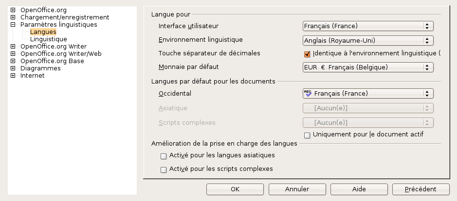 Dans LibreOffice, sélectionner Options → Paramètres linguistiques → Langues :