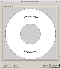 - LaCie LightScribe Labeler for Linux est un programme propriétaire gratuit édité par LaCie qui permet de graver des images et du texte directement sur la face "imprimable" de vos CD / DVD.