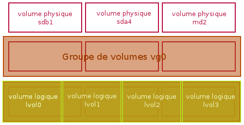Un groupe de volumes ou « VG » pour « volume group » est, comme son nom l'indique, un ensemble de volumes physiques. On a donc un ou plusieurs volumes physiques dans un groupe de volumes, et pour utiliser LVM, il faut obligatoirement au moins un groupe de volumes. Habituellement, sur les gros serveurs, on essaye de regrouper les disques en fonction de leur caractéristiques (capacités, performances, etc.). Pour un particulier, le fait de mettre plusieurs disques dans un même groupe de volume peut permettre « d'étaler » un système de fichiers sur plusieurs disques, et d'avoir donc /home par exemple qui utiliserait 2 disques. Une telle configuration est tout de même assez dangereuse en cas de perte d'un disque… De plus, cela n'apporterait aucun gain de performance contrairement à du RAID-0 par exemple.