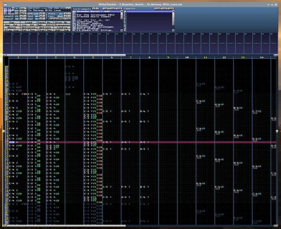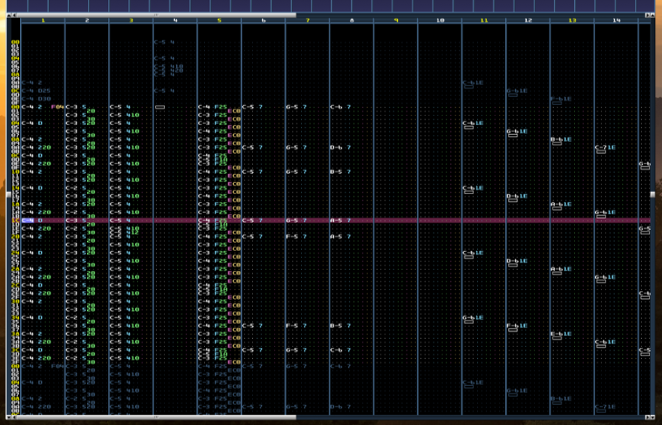- Chaque colonne représente une voix. Une voix est comme une sortie de son ; elle peut jouer de tous les instruments du projet, mais qu'un seul à la fois. Chaque voix contient des informations. Elles ont l'air indéchiffrables, comme ça, mais croyez moi c'est très simple à comprendre : prenez un ligne et une colonne, par exemple celle avec le curseur bleu. (