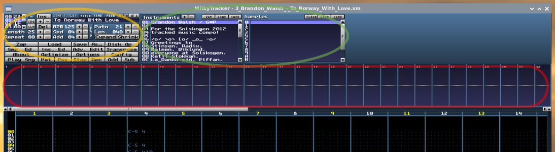Lenghtchange le nombre de patterns dans la listeRepeat: Quand le tracker arrive à la fin du dernier pattern de la liste, il reprend au numéro indiqué de la liste (pas au pattern indiqué)Patnindique le numéro du pattern de l'emplacement actuel. Si on le change, la liste se changera aussi.Len(à ne pas confondre avecLenghtà gauche) ajouter ou enlever des lignes une par une à la fin du pattern actuel (chaque pattern peut avoir un nombre de lignes différent). Par défaut, il est à 40 (soit 64 en base 10) ce qui donne 4 mesures de 16 notes chacune. Attention : La note ajoutée/supprimée est toujours la dernière du pattern.ExpandetShrinkpermettent respectivement de doubler le nombre de notes et de diviser le nombre de notes par deux.BpmetSpdgèrent la vitesse (Bpm = battements par minute et Spd = vitesse de lecture, par défaut 6)