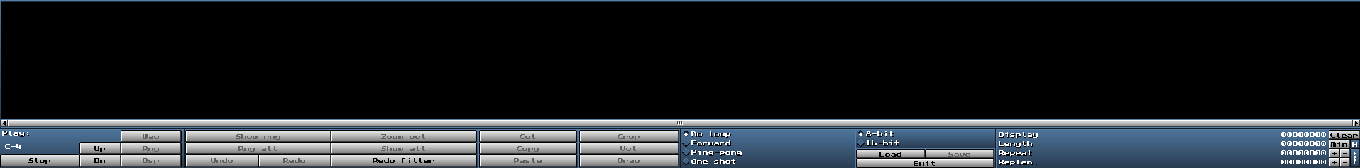 zap: permet de vider au choix le pattern actuel, l'instrument sélectionné ou tout le projet.load: permet d'ouvrir un projet.save: permet d'enregistrer le projetAs…: enregistrement sous.Disk Op.: permet d'exporter au choix le projet, le pattern actuel, l'instrument actuel dans différents format.Sam. Edit: permet d'éditer le sample de l'instrument actuel.Ins. Edit: permet d'éditer l'instrument actuel.Play Sng: lire depuis le début du pattern actuel et poursuivre dans l'ordre de la liste du compteur.Pat: Pattern, lire le pattern actuel en boucle.Pos: Position, lire le pattern actuel en boucle depuis la position actuelle.Stop: Arrêter la lecture.Rec: Ecrire des notes sur le pattern.AddetSub: ajouter ou enlever des voix (colonnes de la partie rouge, voir ci-après).