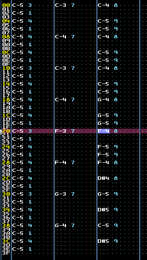 C-4.D.. …)C-4est la note à jouer. Je rappelle que dans ce logiciel, il n'y a pas de notes à la française (do-ré-mi). Ici, la noteC-4représente unDodu quatrième octave..Dcontient le numéro de l'instrument qui doit jouer cette note. Ici, c'est l'instrument n°D.- les deux points suivants, ceux de couleur verte, sont optionnels mais souvent utilisés : il s'agit du volume de la note (0-40 hexadécimal). Ils ne sont pas présents dans le format .mod.