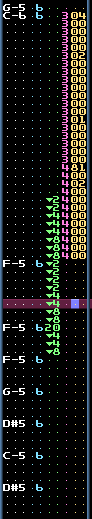 - La voix 6 a quelque chose de particulier, mettez la en solo pour voir. (clic gauche + droit sur son oscilloscope). On peut d’ailleurs voir qu'elle a un même effet du début à la fin : les trois derniers nombres de la voix sur chaque ligne. Cet effet est le n°0, aussi appelé arpège ou arpeggio dans la doc. Pour les connaisseurs en musique, rien à voir avec l'arpège des pianos : ici, le logiciel change de note beaucoup plus vite.