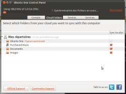- Il est désormais possible de sélectionner les dossiers à synchroniser avec chaque ordinateur (par exemple, synchroniser son dossier Musique entre Ubuntu One et son poste de travail, mais pas vers son netbook qui dispose de trop peu de mémoire). Ceci est gérable à travers le centre de contrôle d'Ubuntu One, qui est remanié. Si un nouveau dossier apparaît dans la liste, une notification vous en informe;