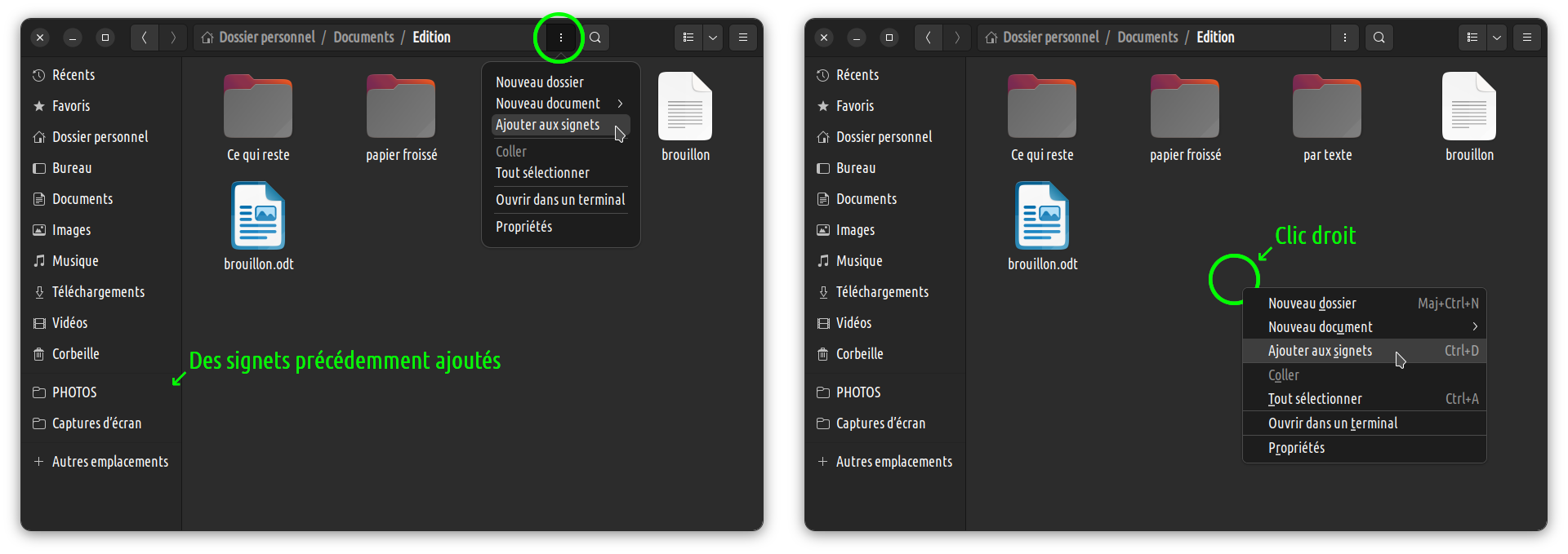 - clic droit sur un espace vide dans le répertoire → Ajouter aux signets
