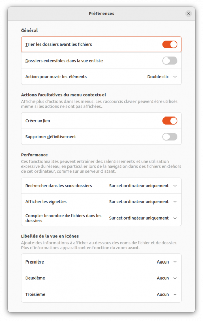 /org/gnome/nautilus/preferences, - et pour les boîtes de dialogue des autre application (lorsqu'on souhaite ouvrir un fichier, ou choisir un emplacement pour en enregistrer un, depuis une autre application), elles se trouvent sous