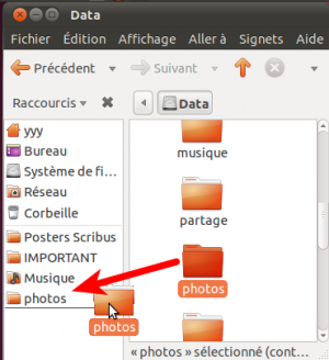 Pour ajouter un répertoire dans ces raccourcis, il suffit de le glisser-déposer de la zone principale à droite vers cette zone du Panneau latéral.