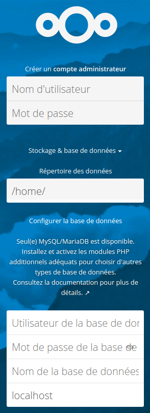 Il faudra aussi indiquer le nom de la base de données. Dans notre exemple ci-dessus, elle s'appelle nextcloud, l'utilisateur et son mot de passe définis plus haut. Par défaut le nom d'hôte est localhost et le port 3306.