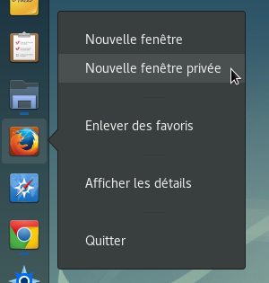 [Desktop Entry] Name=Firefox # [Ici, le reste du lanceur normal pour firefox] # Nouvelle ligne pour lister les actions : Actions=new-window;new-private-window; # Nouvelles sections : [Desktop Action new-window] Name=New Window Name[fr]=Nouvelle fenêtre Exec=firefox -new-window [Desktop Action new-private-window] Name=New Private Window Name[fr]=Nouvelle fenêtre privée Exec=firefox -private-window