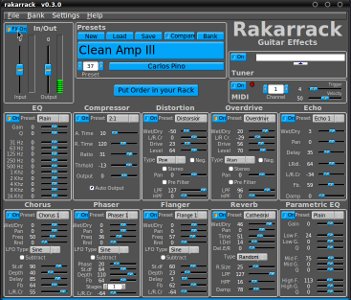 Rakarrack est un magnifique ensemble d'effets développé par le Rakarrack Team basé sur le synthétiseur ZynaddSubFX. Il contient 19 effets: Linear EQ, Compressor, Distortion, Overdrive, Echo, Chorus, Phaser, flanger, Reverb et parametric EQ. Mais ce n'est pas tout. Il a des caractéristiques qui le rendent unique. Il inclut un tuner et un convertisseur MIDI monophonique et est capable de recevoir des signaux MIDI pour contrôler le volume et les changements de programmes. Vous pouvez sauver et restaurer l'état du rack sur fichier et aussi gérer des banques jusqu'à 80 presets. L'application est distribuée avec une banque de 80 effets dans les styles les plus variés. L'interface est configurable.
