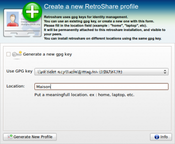 RetroShare base son système d'authentification sur PGP. Au premier lancement, RetroShare vous propose de choisir une clef PGP dans votre trousseau (ou d'en créer une) pour représenter votre identité. La même clef peut être utilisée pour chacun de vos nœuds RetroShare (par exemple si vous avez plusieurs PC). C'est pourquoi, "Location/lieu" vous demande sur quel ordinateur vous opérez.