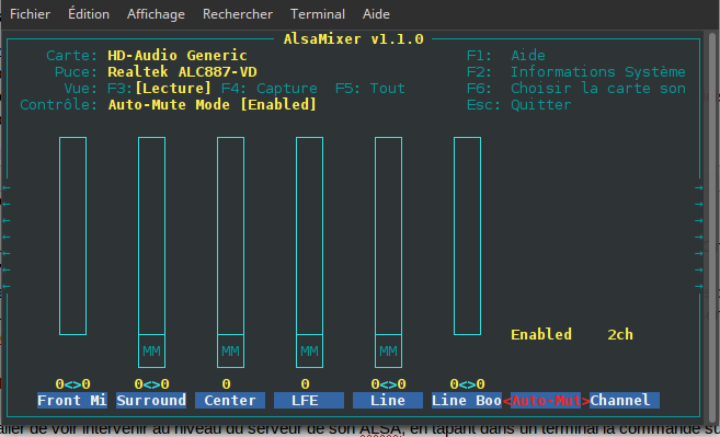 Il arrive parfois que alsa mixer soit mal configuré lors de l'installation. Il est alors nécessaire de le configurer manuellement. Pour cela taper dans un terminal: