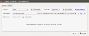 SoundKonverter seul n'est pas très utile. Pour pouvoir convertir des fichiers, il lui faut les codeurs/décodeurs pour chaque format. La plupart sont heureusement disponibles dans les dépôts Ubuntu.