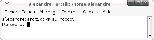 Le mot de passe demandé est celui de l'utilisateur à prendre l'identité. Vous ne prendrez son identité que lorsque le mot de passe est valide. Vous pourrez alors exécuter, dans la console lancée, toutes les actions voulues, comme si vous étiez l'utilisateur auquel vous venez de prendre l'identité. Vous aurez son identité tout au long de cette session en console. Pour mettre fin à cette session, saisissez la commande :