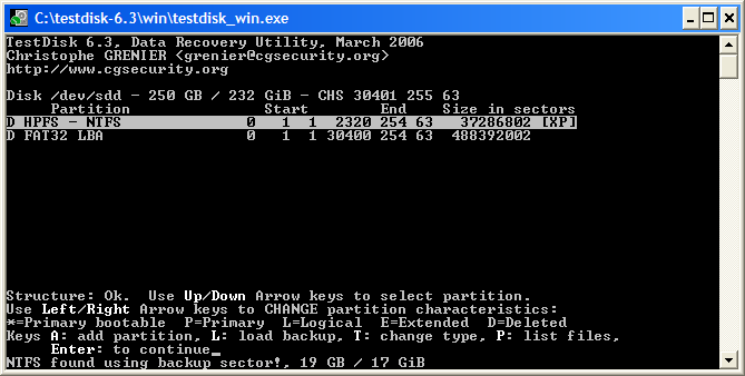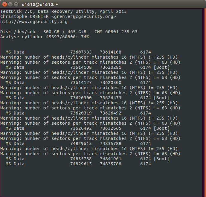 Soit on appuie sur « Entrée » pour arrêter la recherche car nous avons reconnu notre partition (inutile d'attendre qu'il analyse tout le disque).