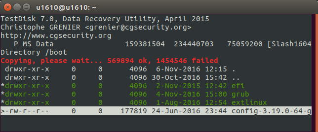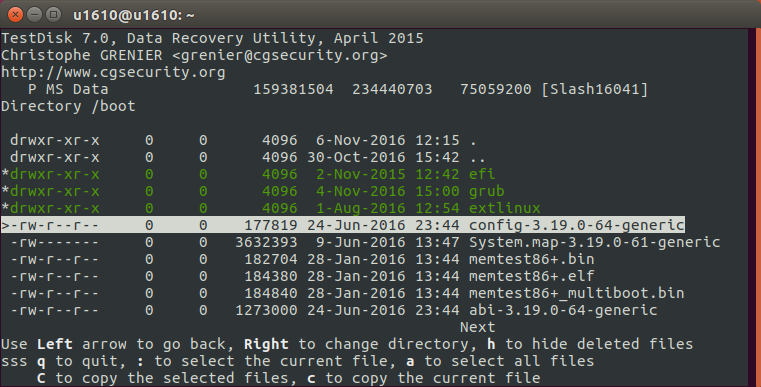 ====================================================================== TestDisk 7.1, Data Recovery Utility, July 2019 Christophe GRENIER <grenier@cgsecurity.org> https://www.cgsecurity.org Linux filesys. data 1054720 4554751 3500032 Directory / >drwxr-xr-x 0 0 4096 2-Dec-2022 16:28 . drwxr-xr-x 0 0 4096 2-Dec-2022 16:28 .. drwx------ 0 0 16384 2-Dec-2022 15:52 lost+found drwxr-xr-x 0 0 4096 2-Dec-2022 15:55 efi drwxr-xr-x 0 0 4096 2-Dec-2022 16:29 grub -rw------- 0 0 6250707 12-Jul-2022 10:51 System.map-5.15.0-43-generic -rw-r--r-- 0 0 261694 12-Jul-2022 10:51 config-5.15.0-43-generic lrwxrwxrwx 0 0 28 2-Dec-2022 16:26 initrd.img lrwxrwxrwx 0 0 28 2-Dec-2022 15:55 initrd.img.old -rw-r--r-- 0 0 182800 6-Feb-2022 21:35 memtest86+.bin -rw-r--r-- 0 0 184476 6-Feb-2022 21:35 memtest86+.elf -rw-r--r-- 0 0 184980 6-Feb-2022 21:35 memtest86+_multiboot.bin lrwxrwxrwx 0 0 25 2-Dec-2022 16:26 vmlinuz lrwxrwxrwx 0 0 25 2-Dec-2022 16:26 vmlinuz.old Next Use Right to change directory, h to hide deleted files =============================================================
