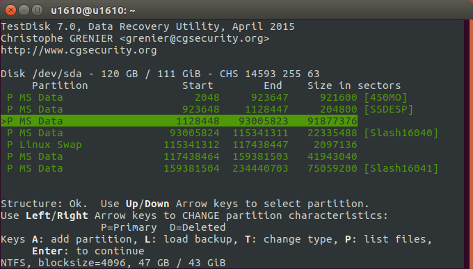 Pour récupérer cette partition, il faut appuyer sur les flèches droite et gauche. En effet, on remarque au début de la ligne un « D » ce qui signifie Deleted (effacée) on va changer ça. On peu choisir soit :