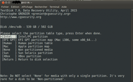 On choisit le type de partition. Notez qu'on peut ainsi récupérer différents systeme_de_fichiers : des disques XBox, Mac ou Sun. Dans la plupart des cas, ce sera Intel donc pour un PC Windows ou GNU/Linux.