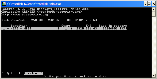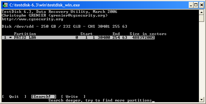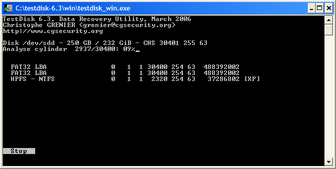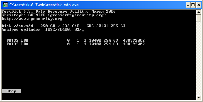 On laisse mijoter ainsi longtemps… très longtemps ici pour un disque dur de 250 Gio Mais on constate que, au bout de quelques secondes, il a déjà retrouvé la partition :