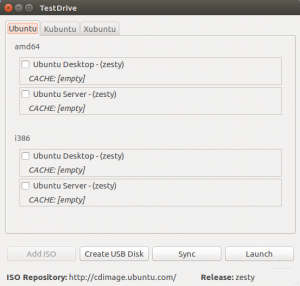 La fenêtre qui s'ouvre liste diverses variantes d'images disque de la version de développement d'Ubuntu disponibles actuellement à tester. Cochez la version d'Ubuntu que vous souhaitez tester (image pour postes de travail, image pour serveurs ; en version 32 bits ou 64 bits) puis appuyez sur Launch. TestDrive se charge du reste !