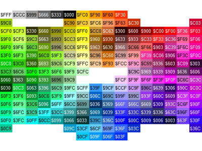 Pour ajouter des couleurs à votre pseudo, écrivez $fff suivi de votre pseudo (le premier f pour le rouge, le deuxième pour le vert et le troisième pour le bleu). Les valeurs vont de 0 à f (0123456789abcdef). Voici un aperçu de quelques couleurs disponibles: