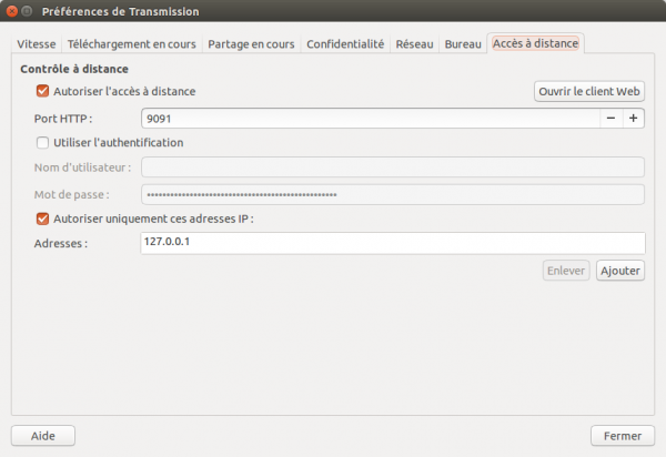 Il ne reste plus qu'à activer le plugin que vous venez d'installer. Pour cela, rendez-vous dans les préférences de Transmission (Édition → Préférences), onglet Accès à distance, et cochez la case Autoriser l'accès à distance.