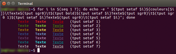 La commande setaf, suivie d'un code numérique de 1 à 7 permet de changer la couleur du texte. Setaf fonctionne avec les terminaux xterm (a priori cas général sous Ubuntu). On utilise sgr0 pour revenir aux valeurs par défaut. syntaxe :