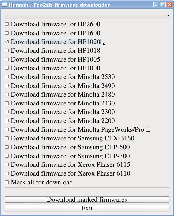 Il vous faudra encore télécharger le micrologiciel propriétaire propre à votre imprimante avec Hannah un logiciel graphique de téléchargement des microprogrammes (« firmware ») pour le paquet foo2zjs.