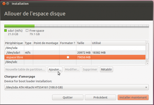 En standard, l'installateur vous propose d'installer UBUNTU à côté des autres logiciels. C'est une solution qu'il est possible d'utiliser. Dans ce cas, il installera la partition / sur la totalité de l'espace disque restant.