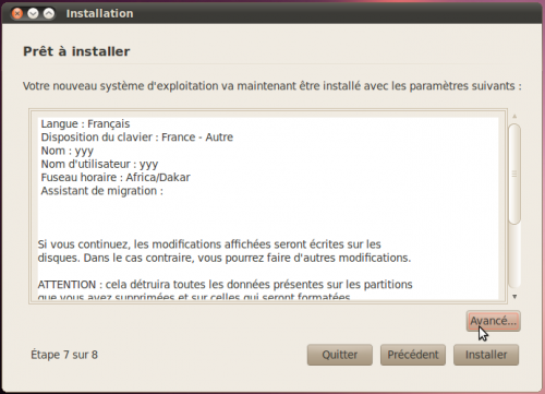 Pour cela, lorsque vous voyez l'écran récapitulatif ci-dessous, cliquez sur le bouton «avancé» en bas à droite.