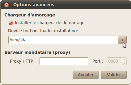 Les deux écrans ci-dessous correspondent à Ubuntu 10.04. Pour la version Ubuntu 11.10, la sélection pour le chargeur d'amorçage se fait à l'étape "Allouer de l'espace disque" en même temps que la configuration des partitions :
