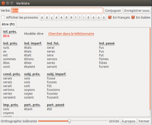 Premièrement, Verbiste est la version GUI de french-conjugator qui est une bibliothèque écrite en C++ qui peut être appelée de la ligne de commande ou à partir d’une autre application.