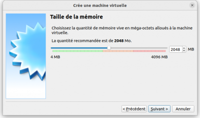 Attention, la mémoire vive (RAM) allouée à une machine virtuelle sera indisponible pour le système hôte durant le fonctionnement de la machine virtuelle. Voici un exemple. Vous créez une machine virtuelle pour installer Windows XP et vous allouez 2'500 Mo de RAM pour cette machine virtuelle. Dans le cas où votre ordinateur hôte à 4 Go (=4'000 Mo) de RAM, lorsque la machine virtuelle est lancée, votre système hôte n'a plus que 1'500 Mo de RAM pour tourner. Si vous lancer une deuxième machine virtuelle qui consomme 1'000 Mo de RAM, votre système hôte n'aura plus que 500 Mo de RAM pour lui et a de forts risques de planter pour insuffisance de RAM. Un ordinateur avec 8 Go ou même 16 Go est plus adapté pour faire tourner des machines virtuelles.