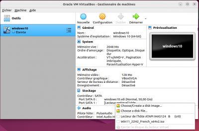 - Fichier → Gestionnaire de supports virtuels, pour gérer les images de disque dur virtuel, CD-ROM et disquette ;