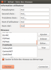 Enfin dans Favorite channels ou dans l'onglet Autojoin channels pour HexChat, entrez tous les canaux auxquels vous souhaitez vous connecter, séparés par une virgule par (exemple #ubuntu-doc,#ubuntu-africa,#ubuntu-fr) Fermez la fenêtre d'édition, puis cliquez sur Connecter.