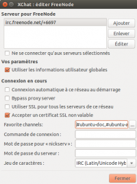 Dans la fenêtre qui s'ouvre (dans notre exemple nous avons pris freenode), double-cliquez sur l'adresse du serveur en haut de la fenêtre et remplacer 8001 par +6697, puis cochez la case Accepter un certificat SSL non valable. Enfin dans Favorite channels ou dans l'onglet Autojoin channelts pour HexChat, entrez tous les canaux auxquels vous souhaitez vous connecter, séparés par une virgule par (exemple #ubuntu-doc,#ubuntu-africa,#ubuntu-fr)